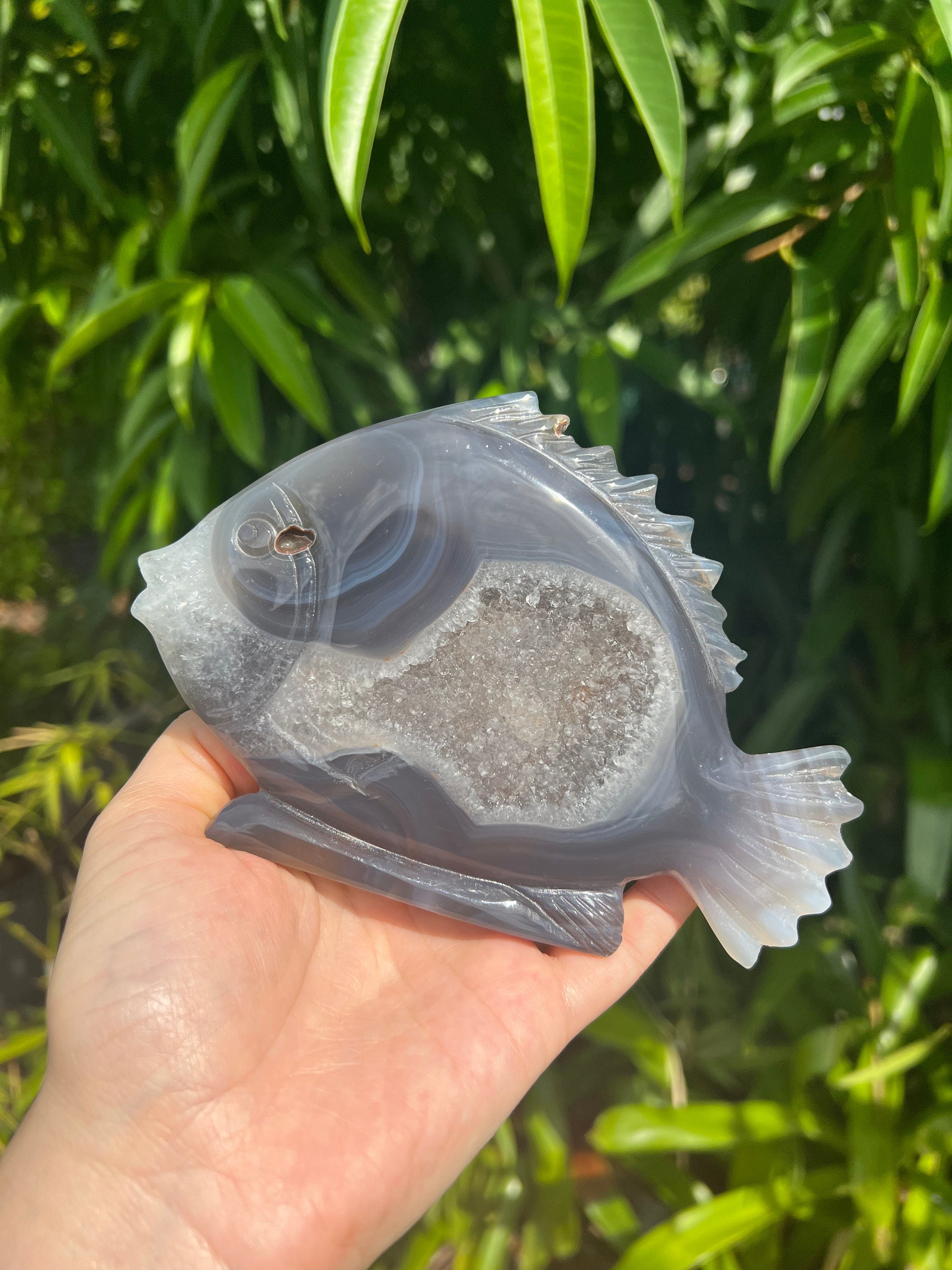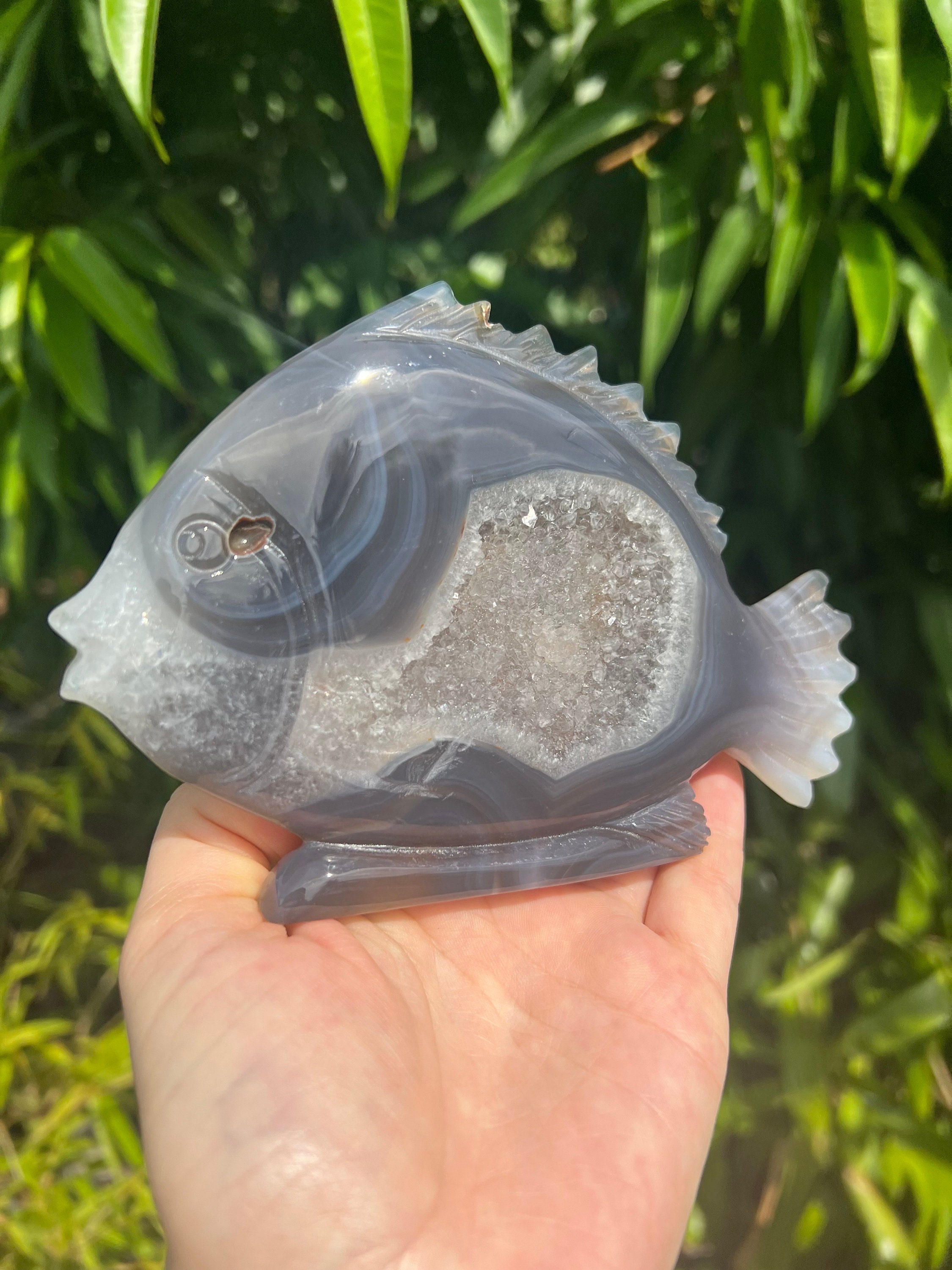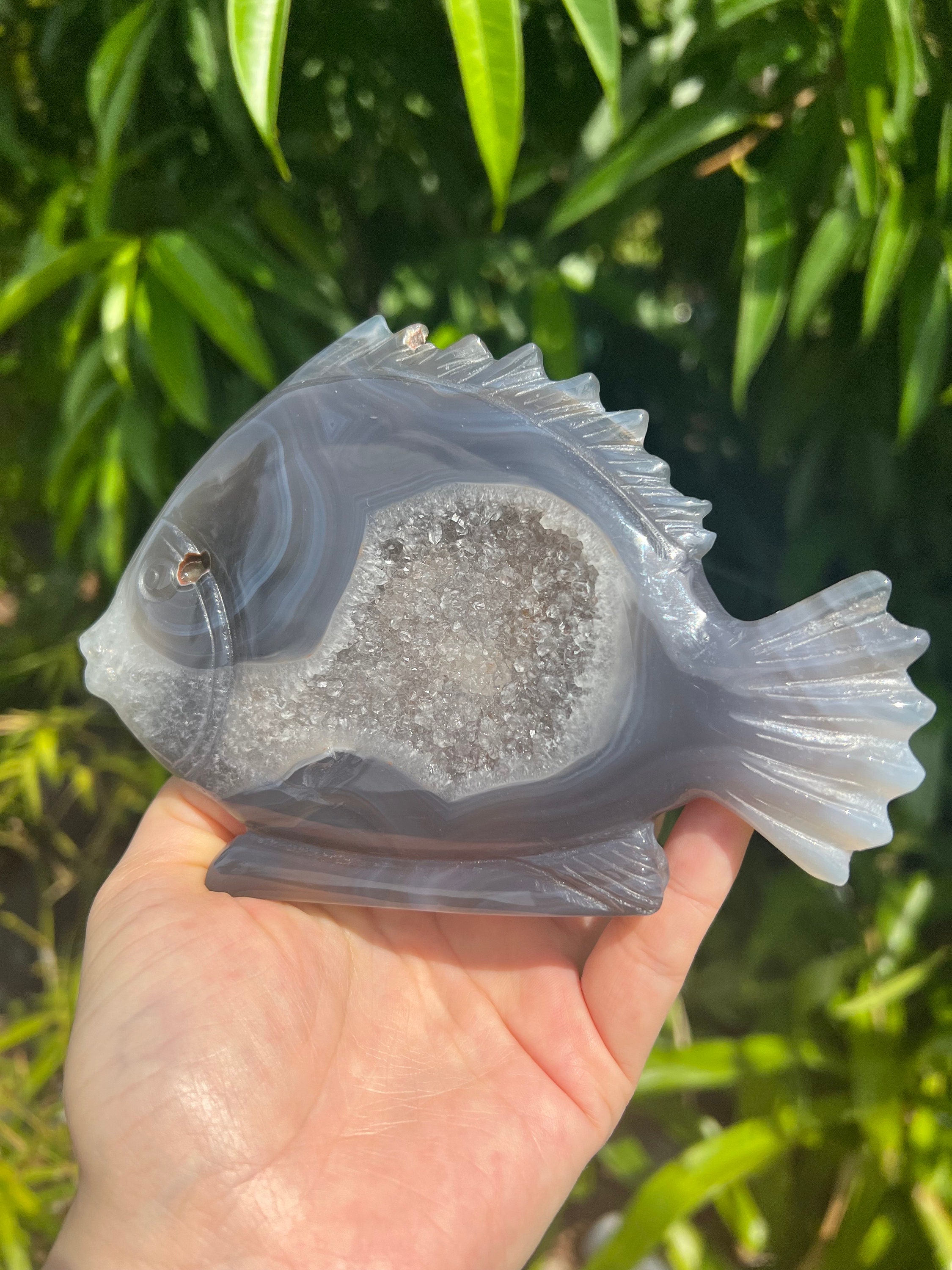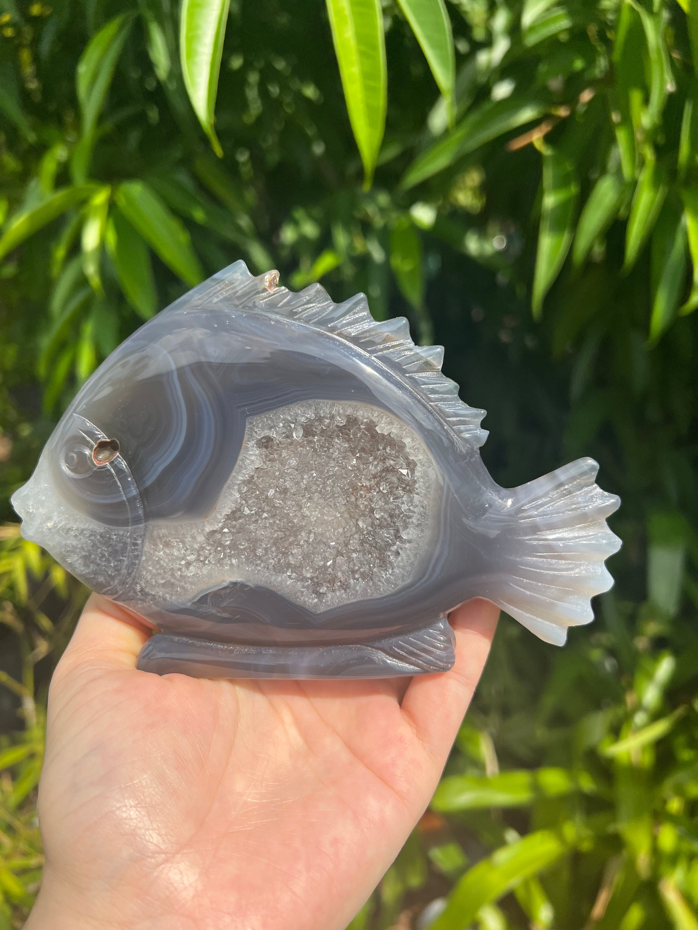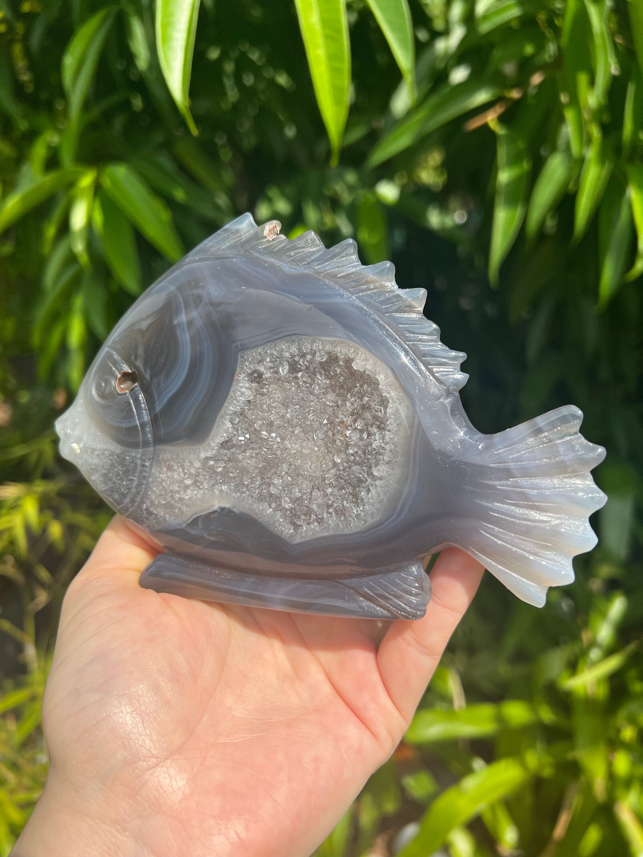 This beautiful agate carving depicts a small fish with stunning druzy, creating a sense of harmony and unity. The intricate details of the carving make it a one-of-a-kind piece that will stand out in any collection.
