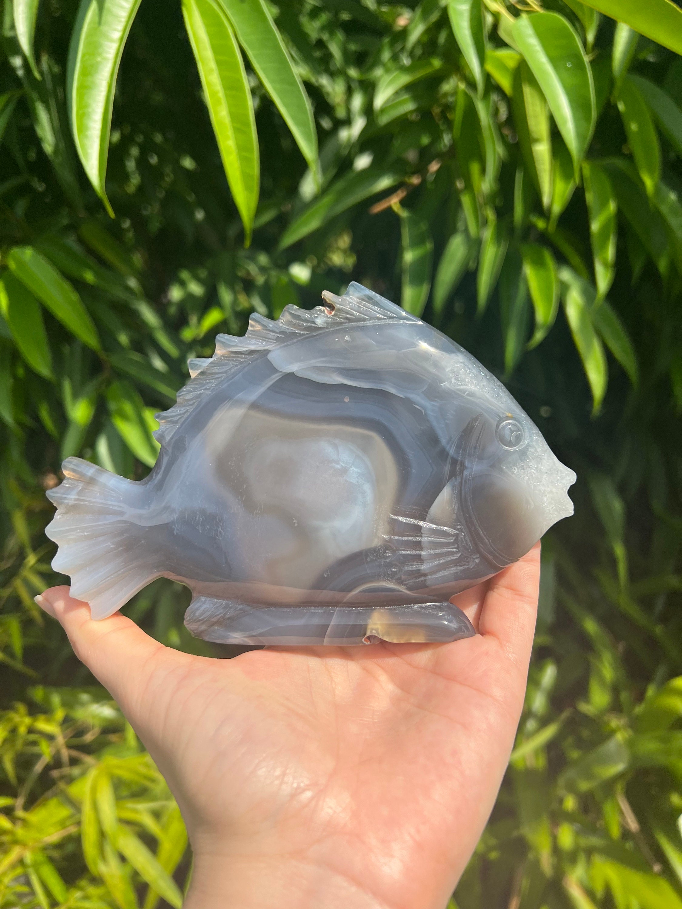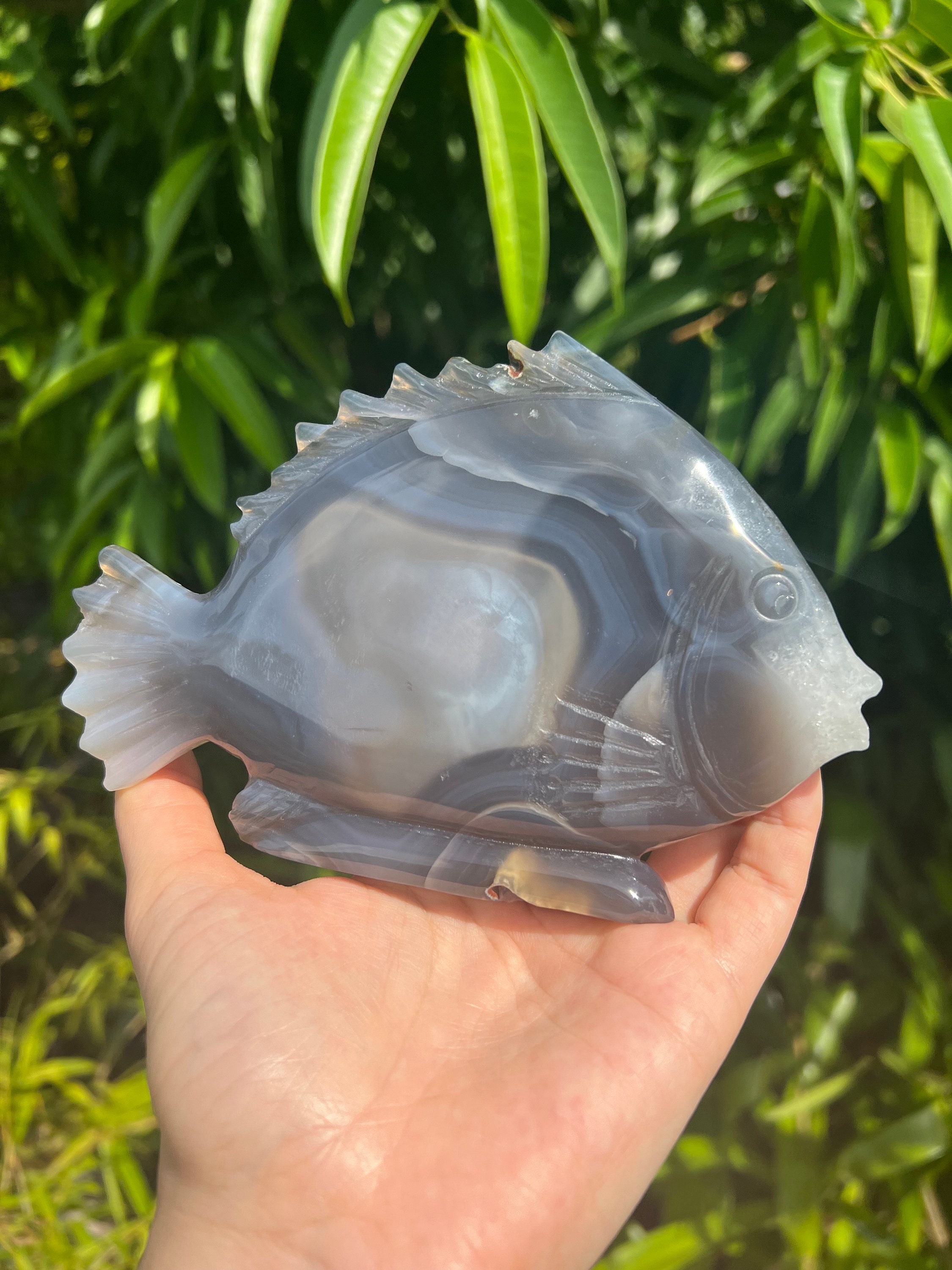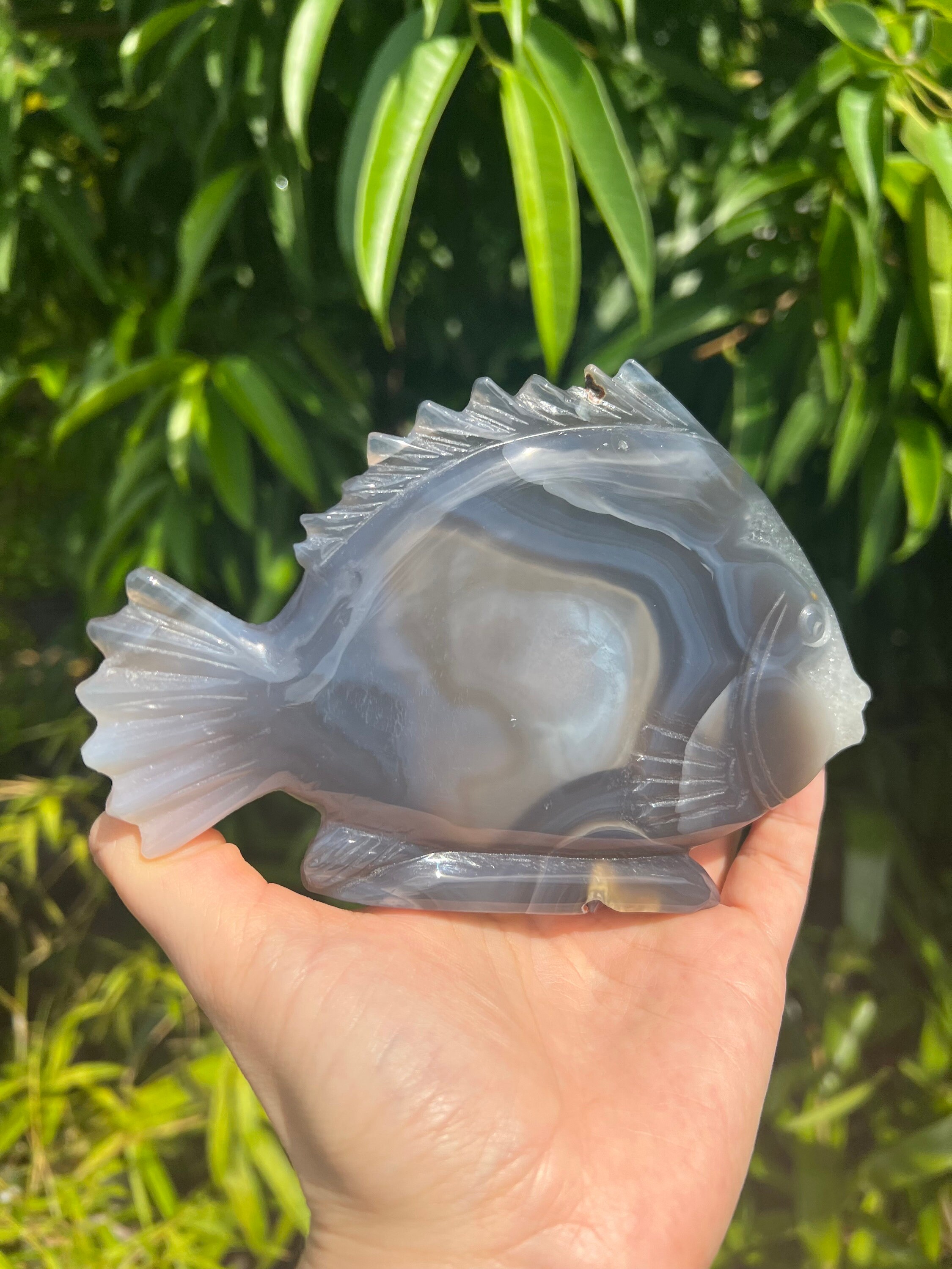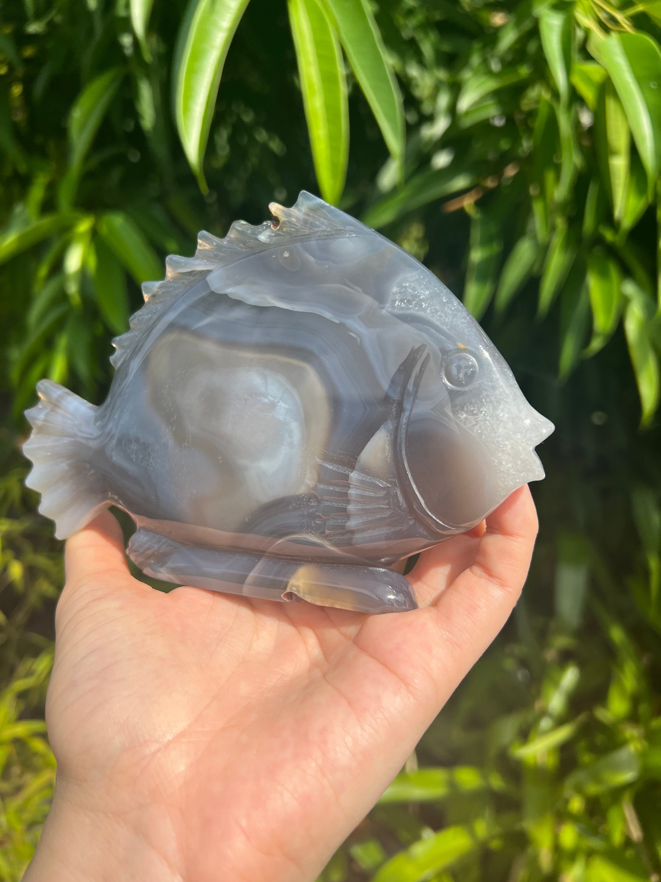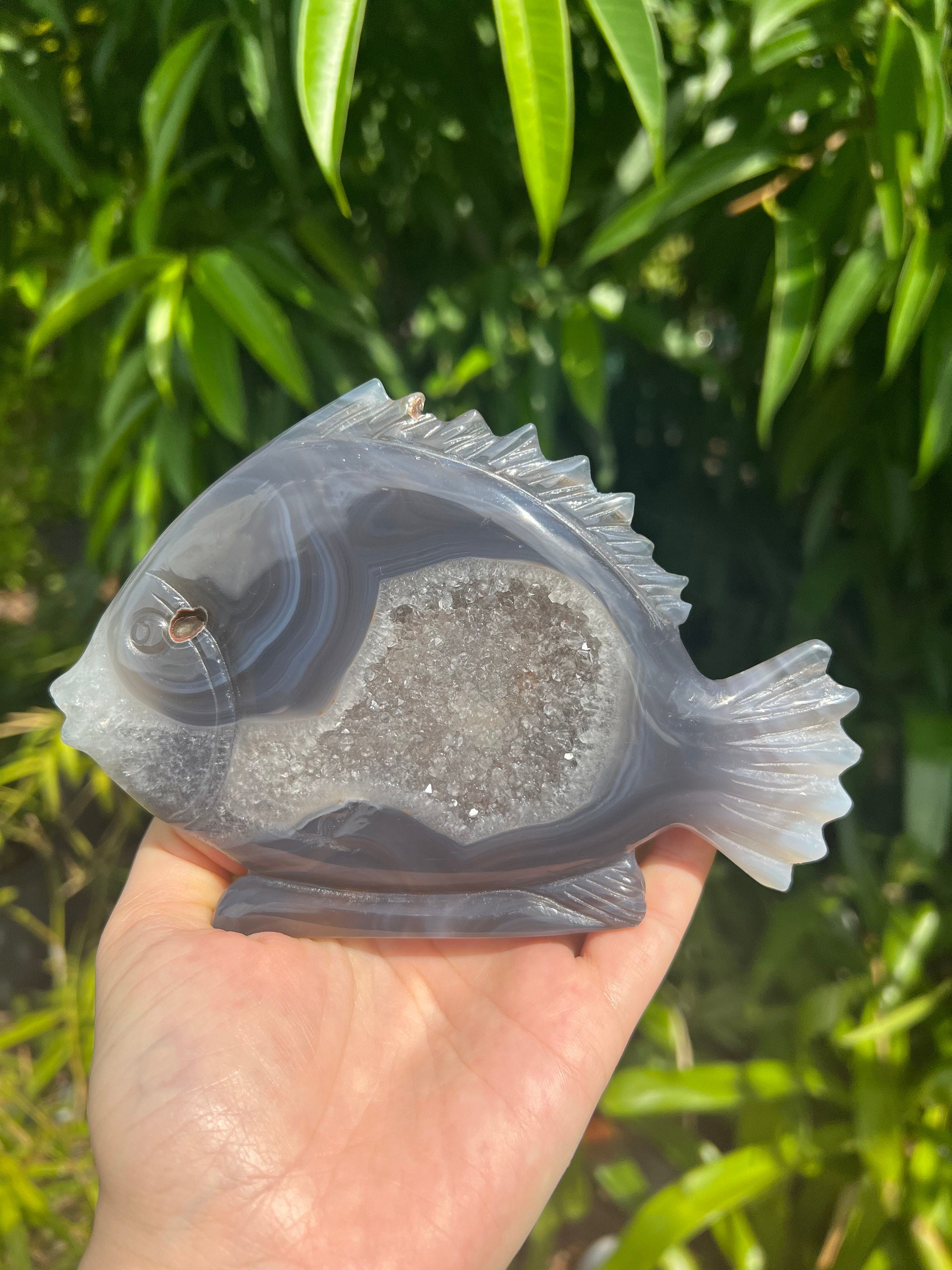 This beautiful agate carving depicts a small fish with stunning druzy, creating a sense of harmony and unity. The intricate details of the carving make it a one-of-a-kind piece that will stand out in any collection.