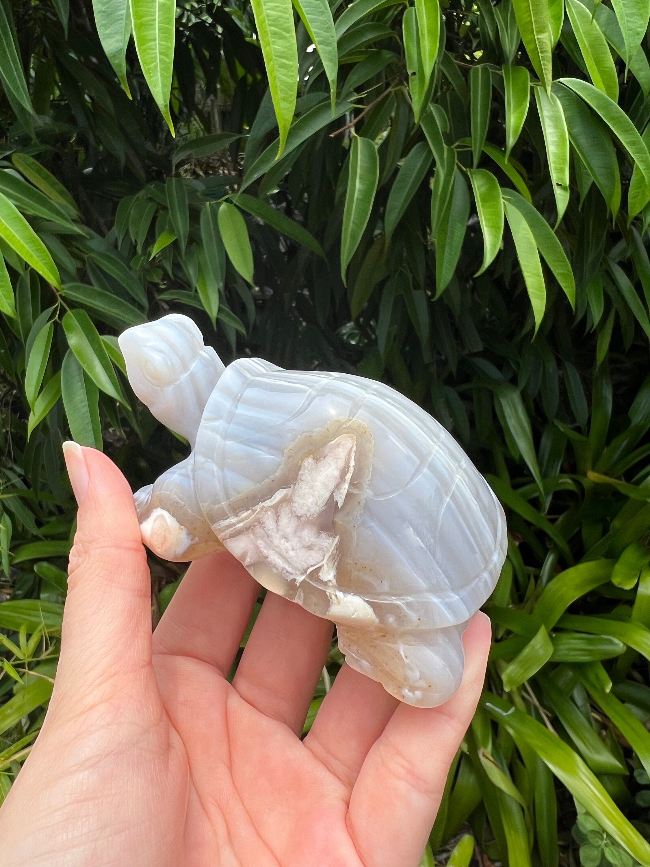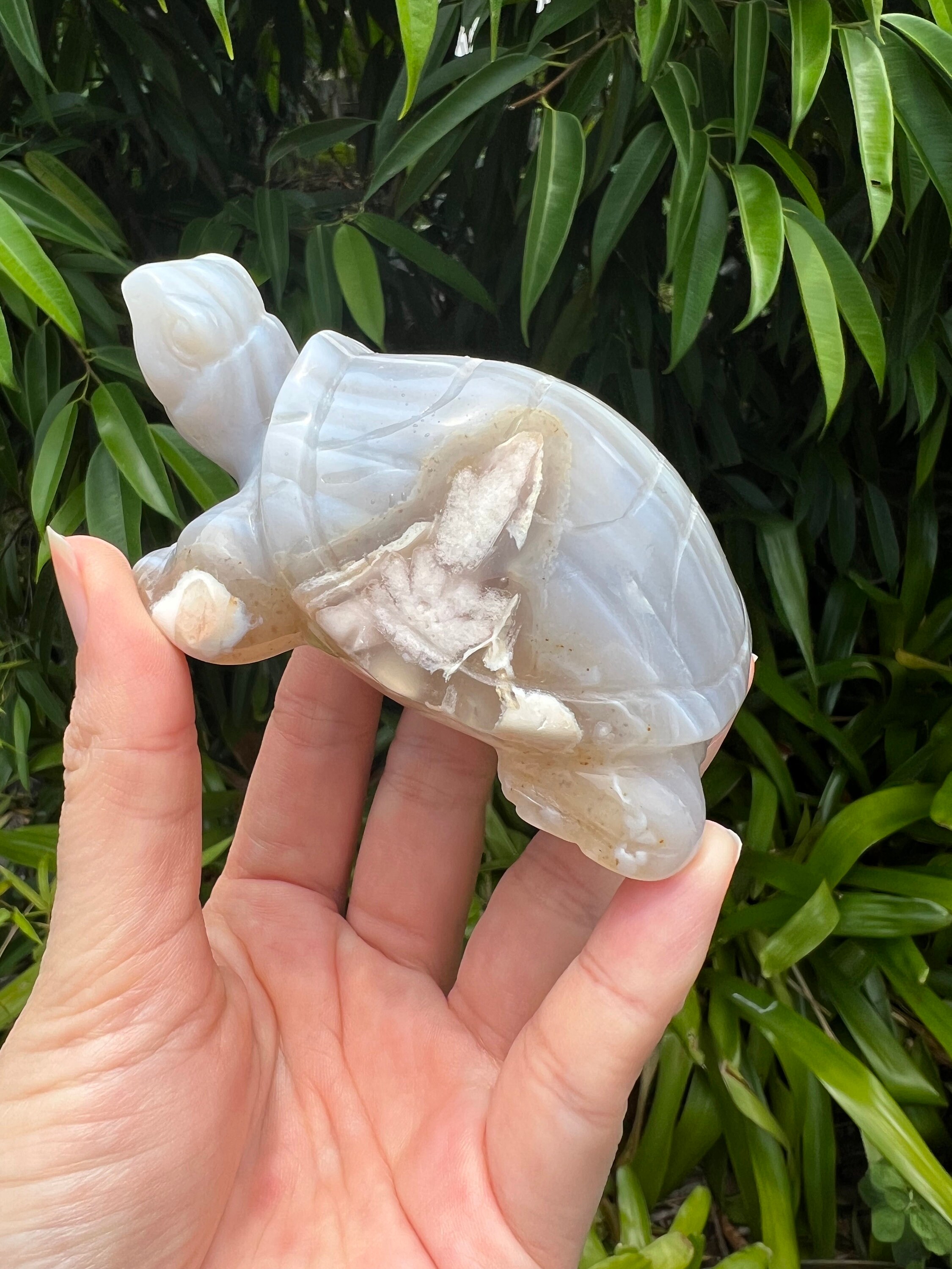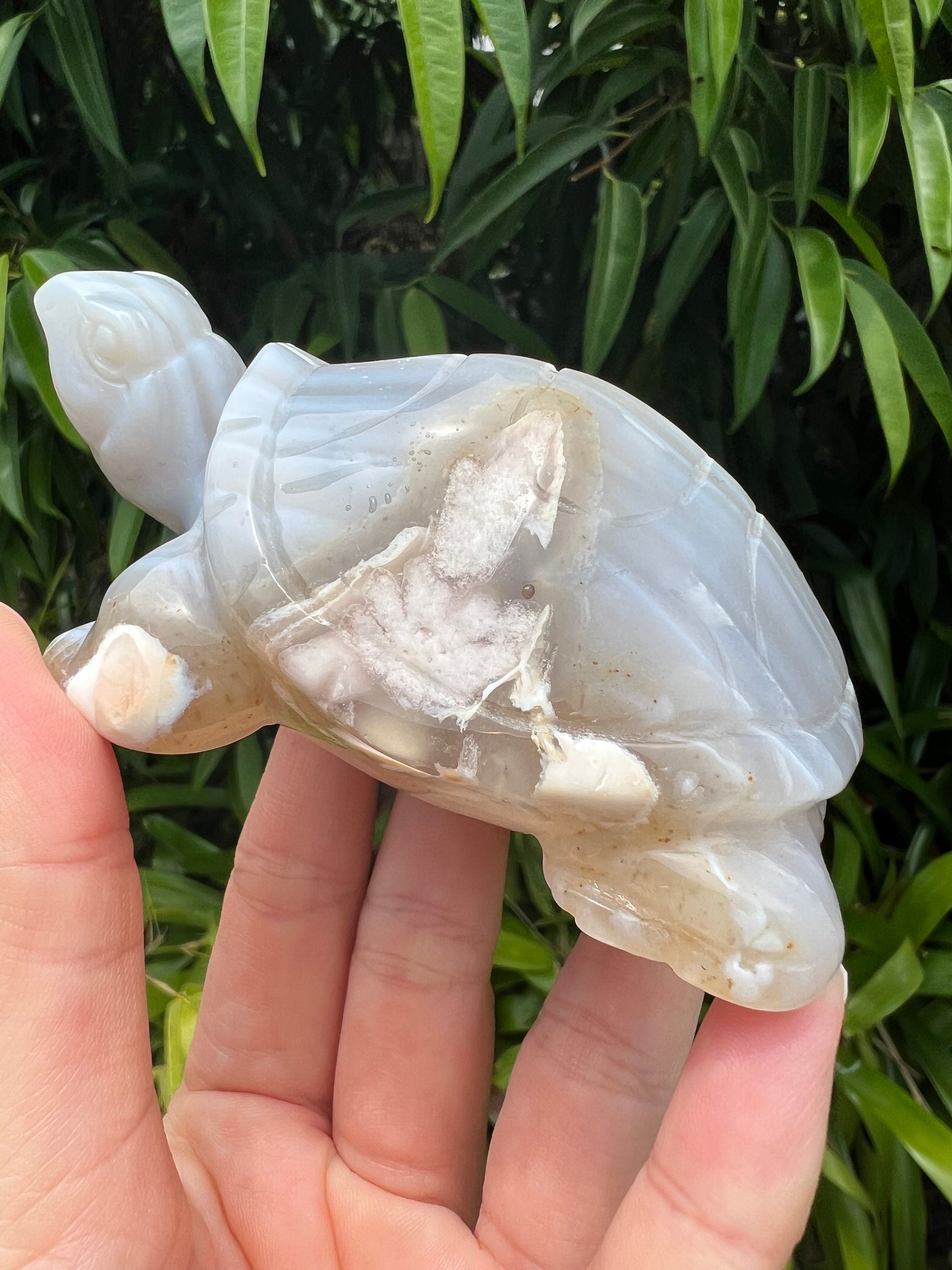 Turtles are a symbol of wisdom, protection, and longevity. They remind us to take things slow and steady and that patience is the key to success. Meanwhile, flower agate stone is a gemstone that represents growth, abundance, and new beginnings.