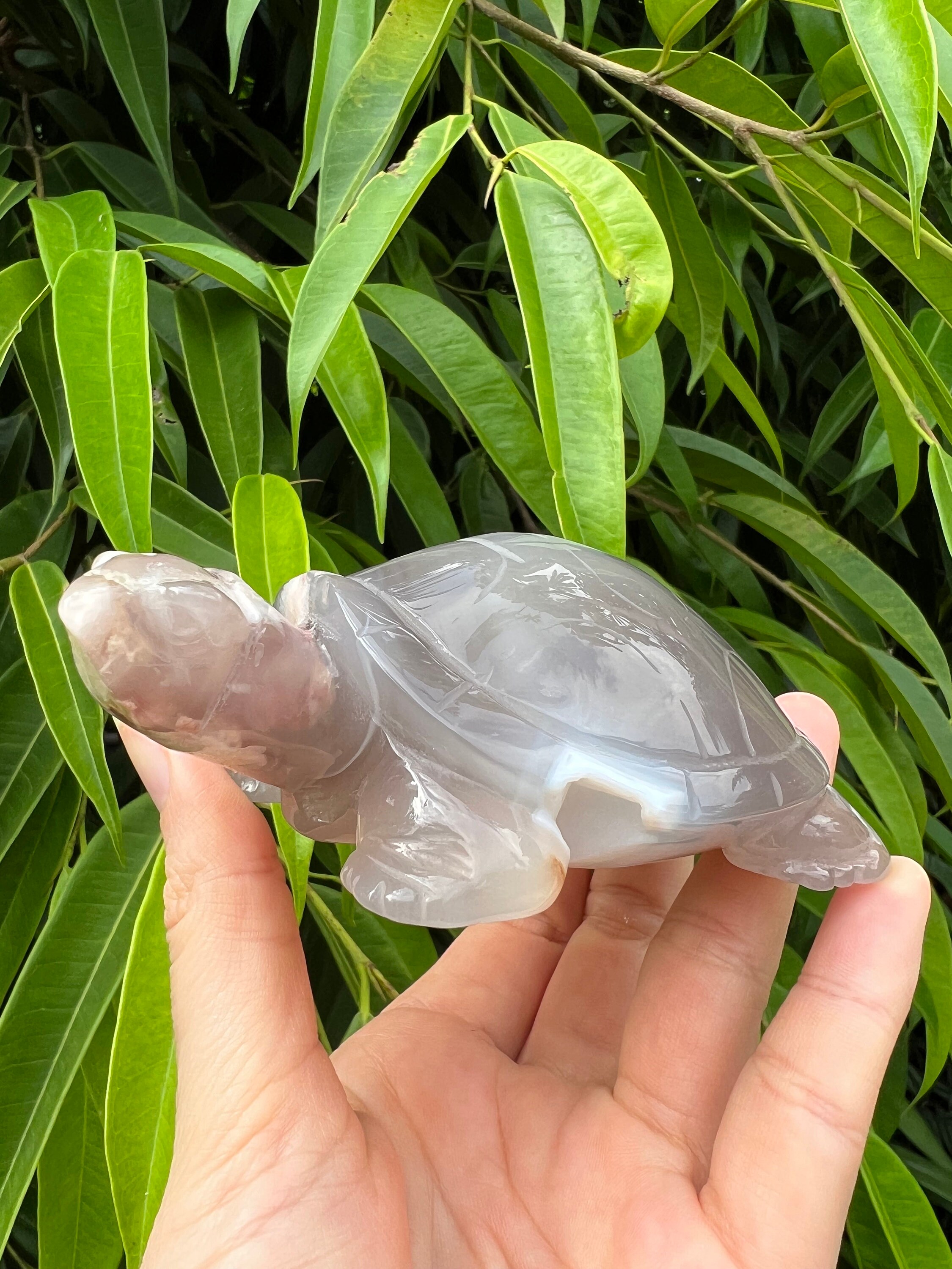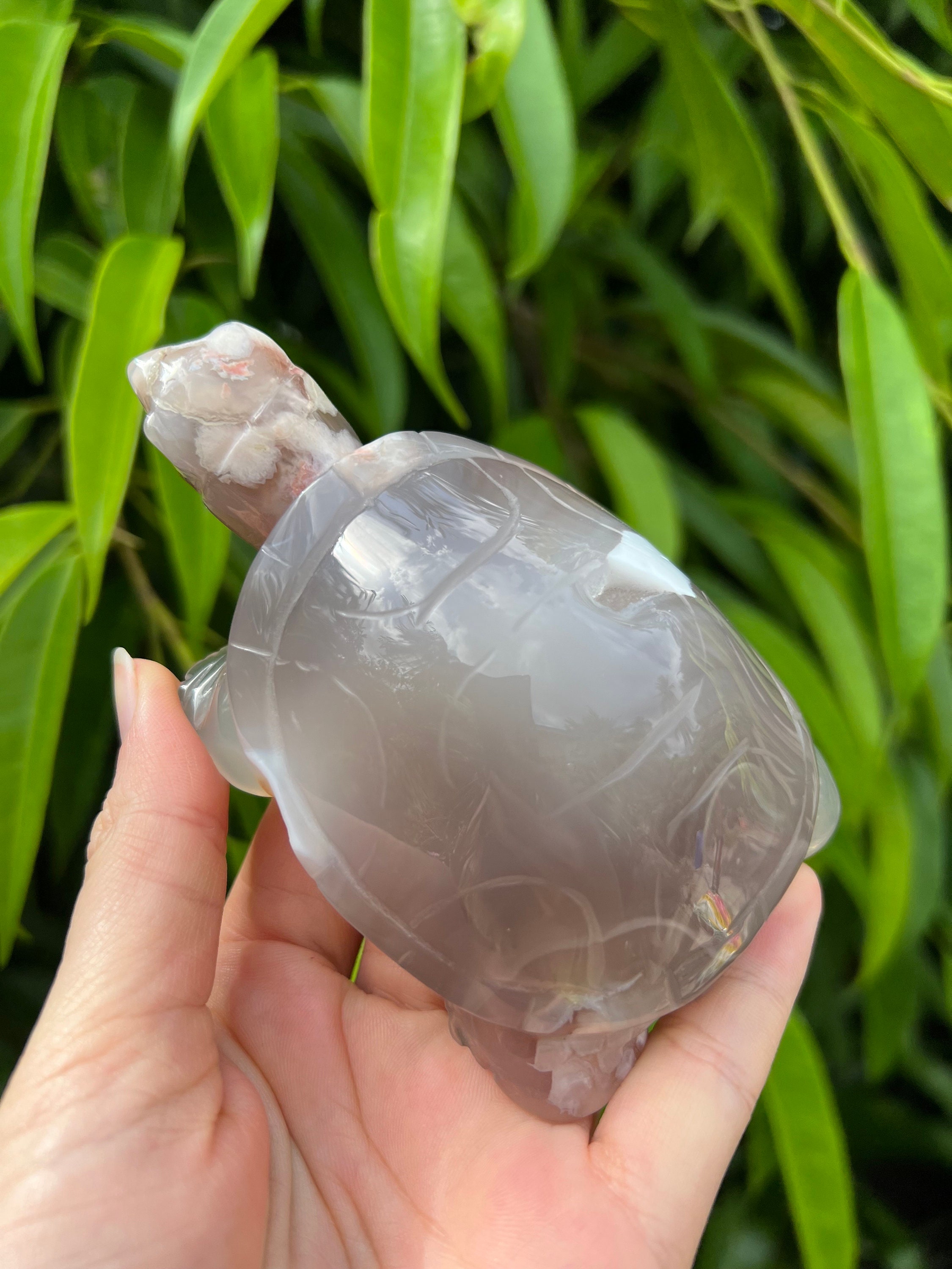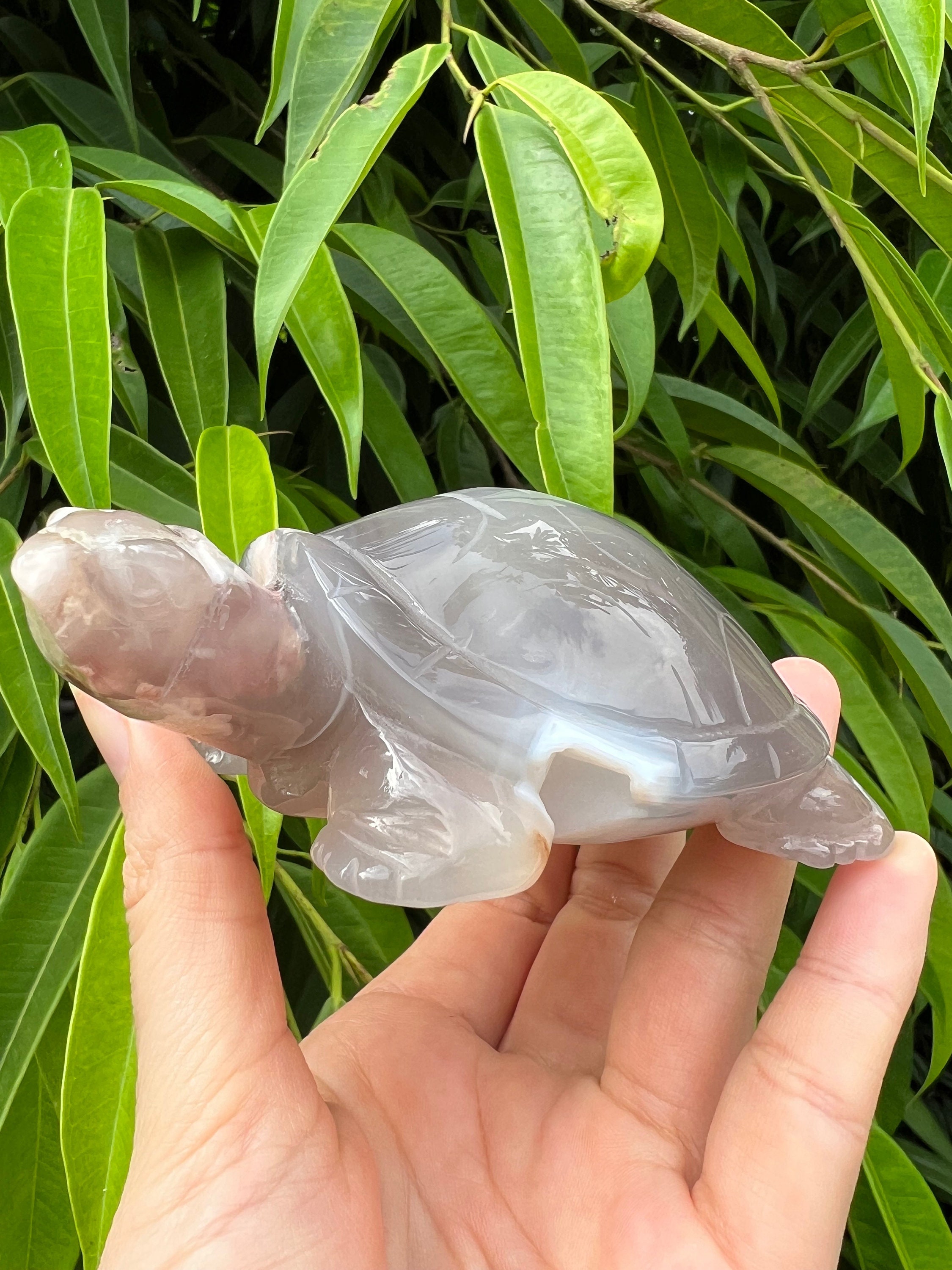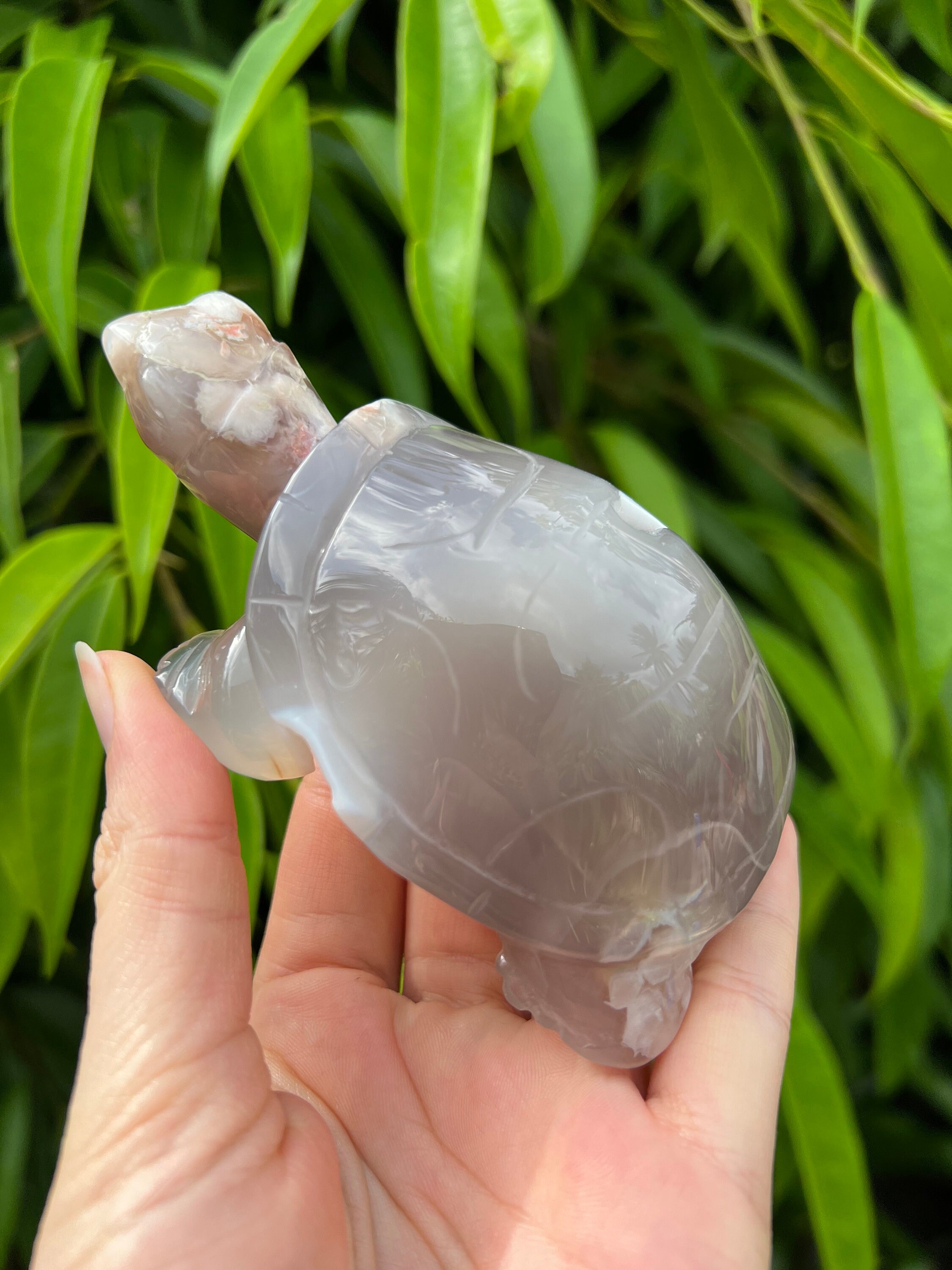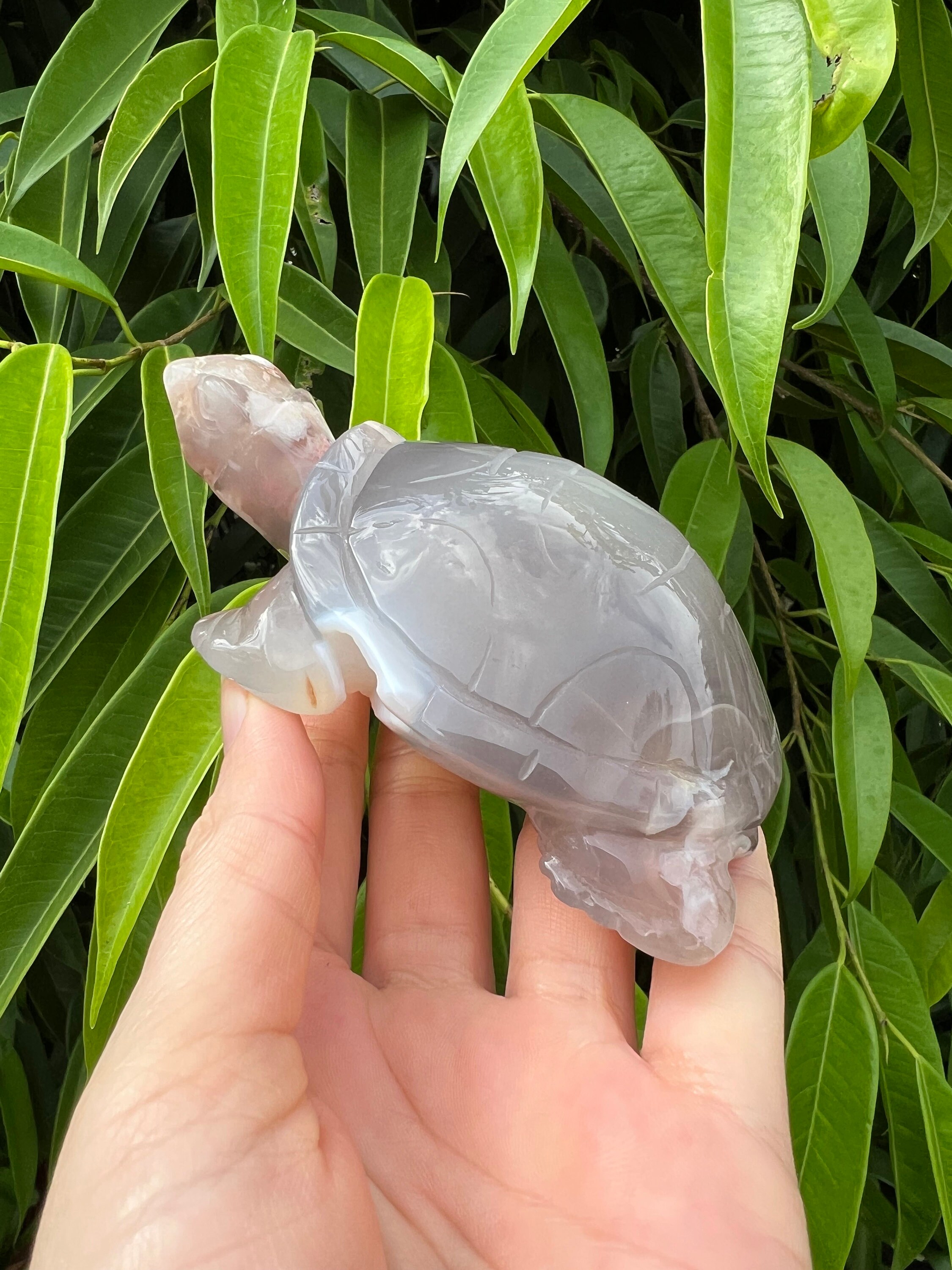 This carving, therefore, represents the spiritual qualities of both the turtle and flower agate stone. The turtle’s slow and steady pace reminds us to trust the journey and that we will get to our destination in due time. Flower agate stone helps to promote growth, abundance, and new beginnings, reminding us to embrace change and take advantage of new opportunities.