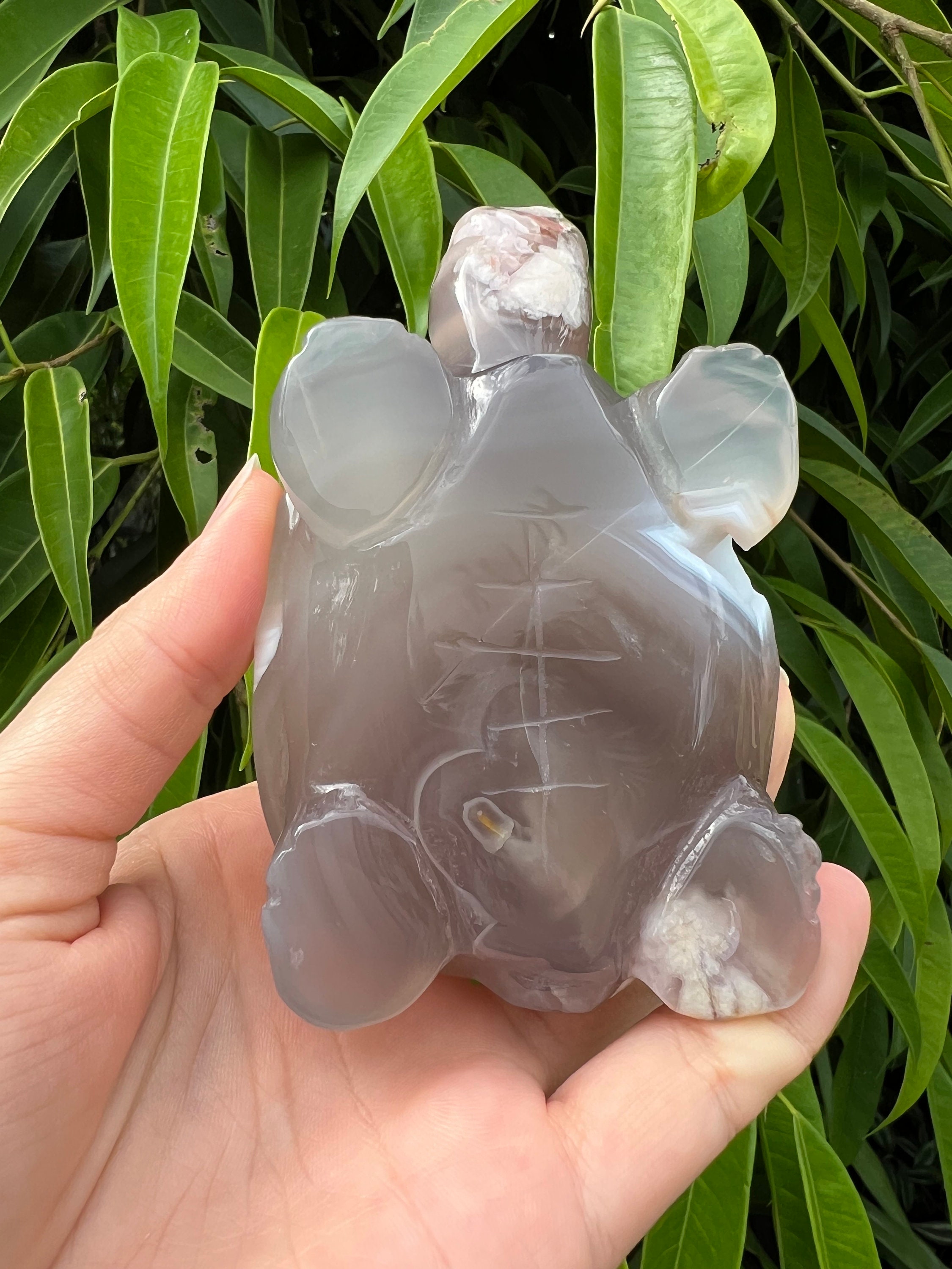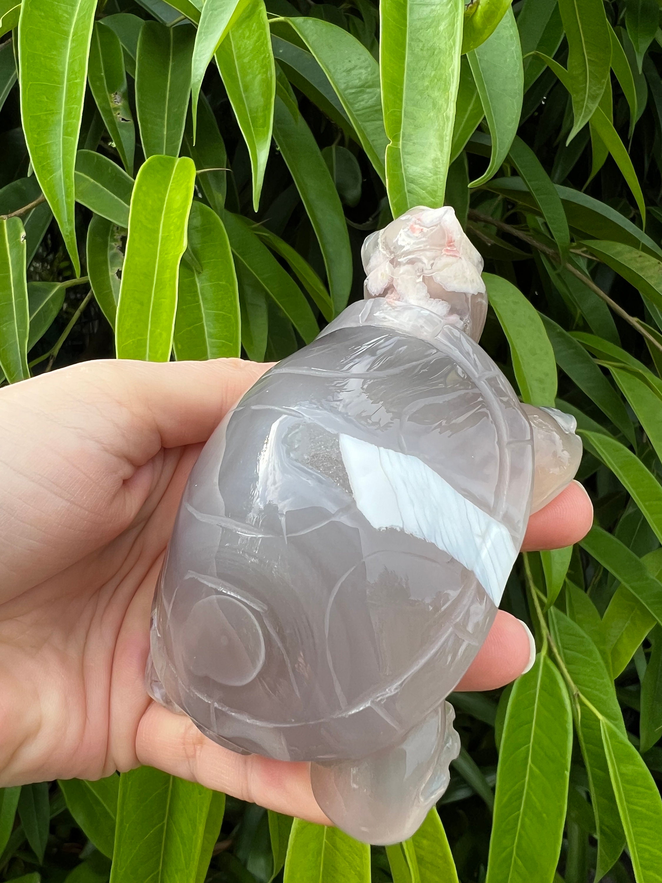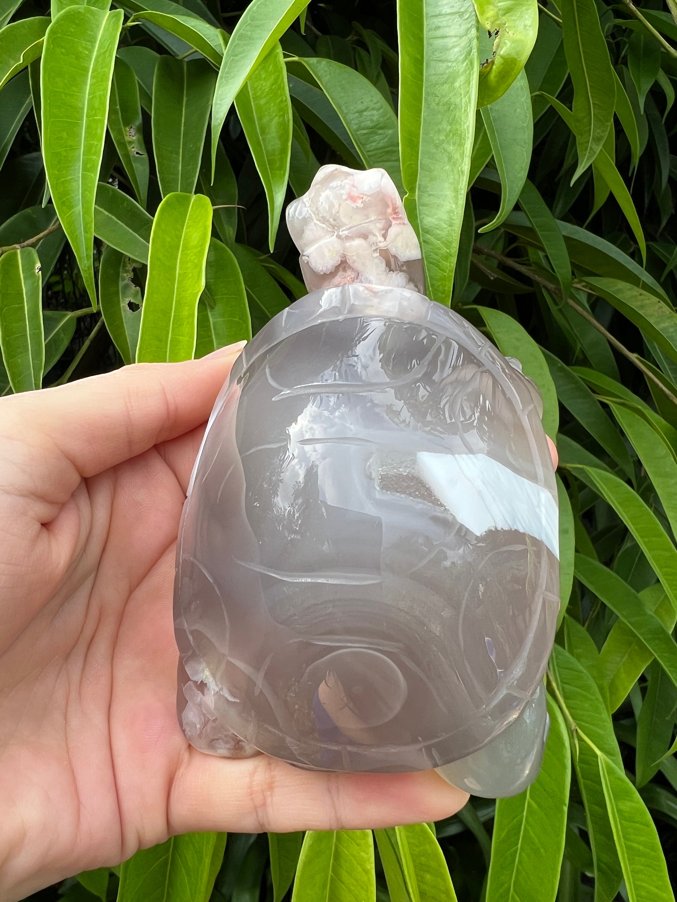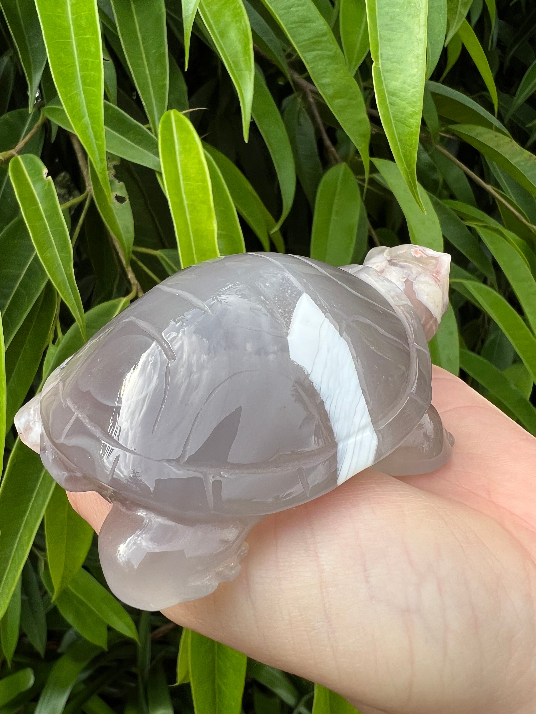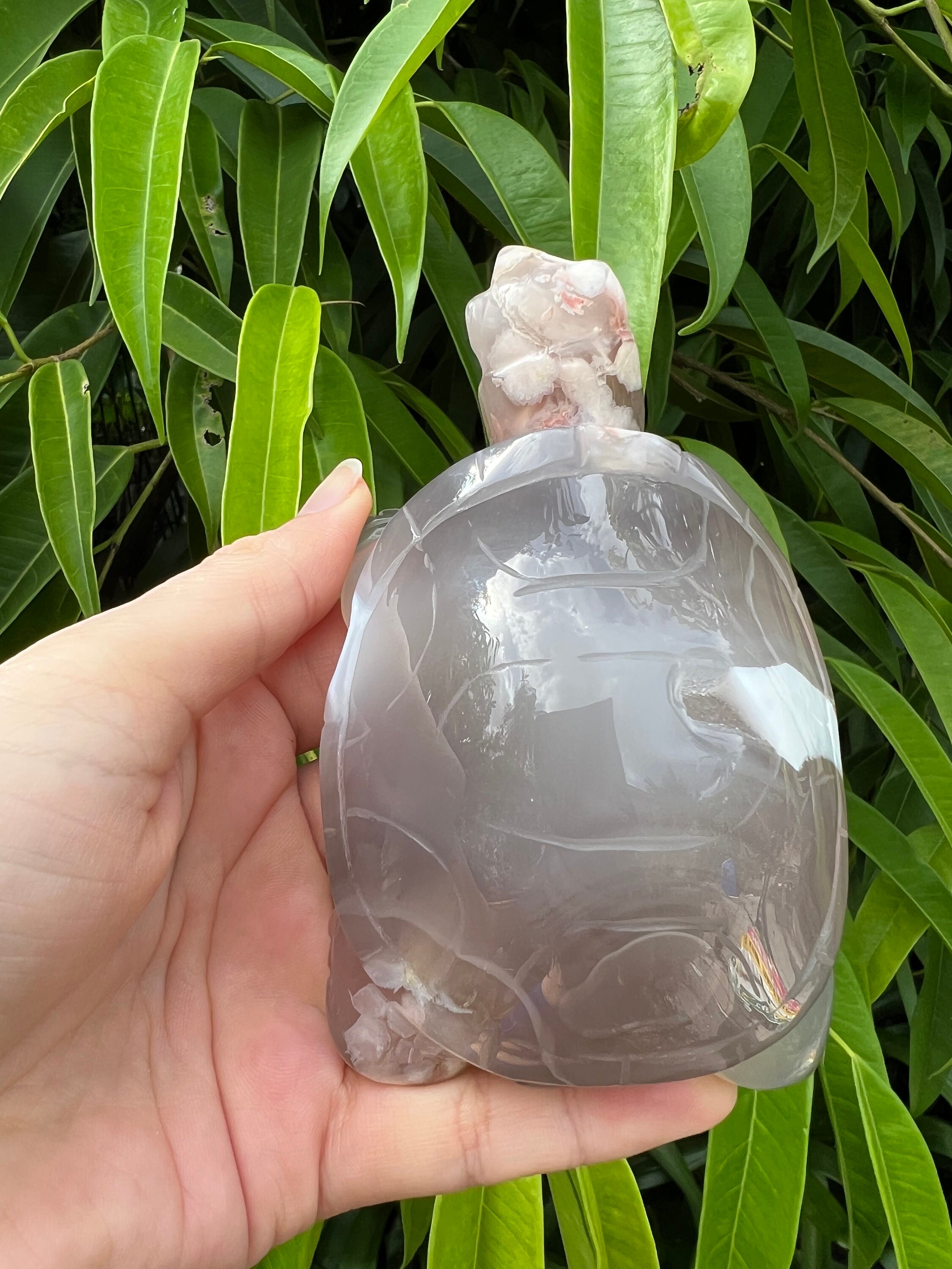 This carving, therefore, represents the spiritual qualities of both the turtle and flower agate stone. The turtle’s slow and steady pace reminds us to trust the journey and that we will get to our destination in due time. Flower agate stone helps to promote growth, abundance, and new beginnings, reminding us to embrace change and take advantage of new opportunities.